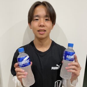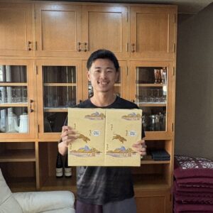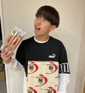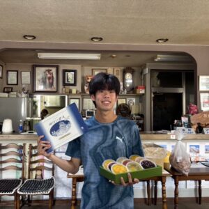 農大理事の菅原様より、アクエリアスとお饅頭、